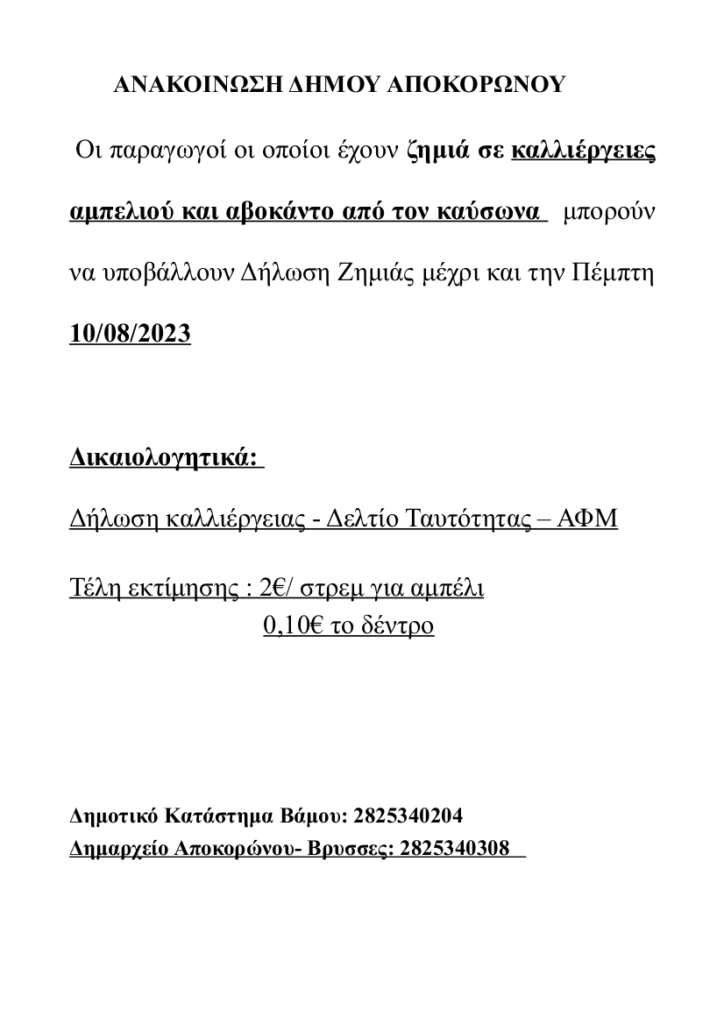 ΑΝΑΚΟΙΝΩΣΗ ΕΛΓΑ ΓΙΑ ΖΗΜΙΑ ΣΕ ΑΜΠΕΛΙ ΚΑΙ ΑΒΟΚΑΝΤΟ