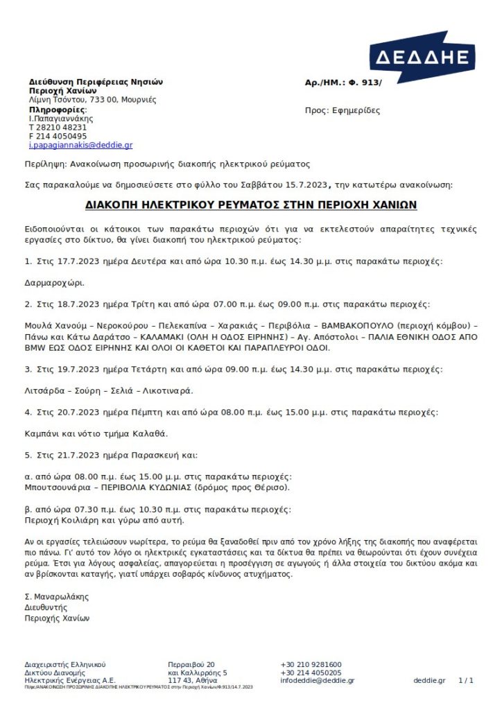 Aνακοίνωση προσωρινής διακοπής ηλεκτρικού ρεύματος