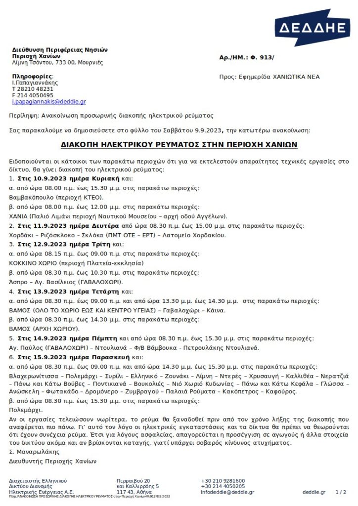 Aνακοίνωση προσωρινής διακοπής ηλεκτρικού ρεύματος