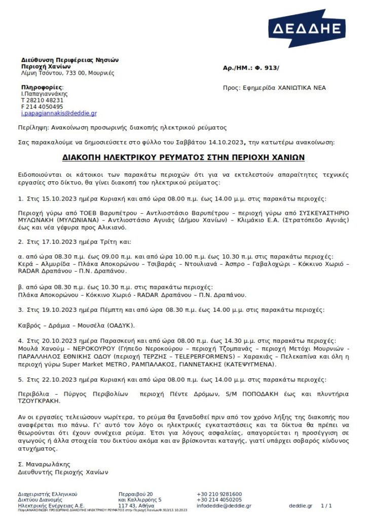 Ανακοίνωση προσωρινής διακοπής ηλεκτρικού ρεύματος