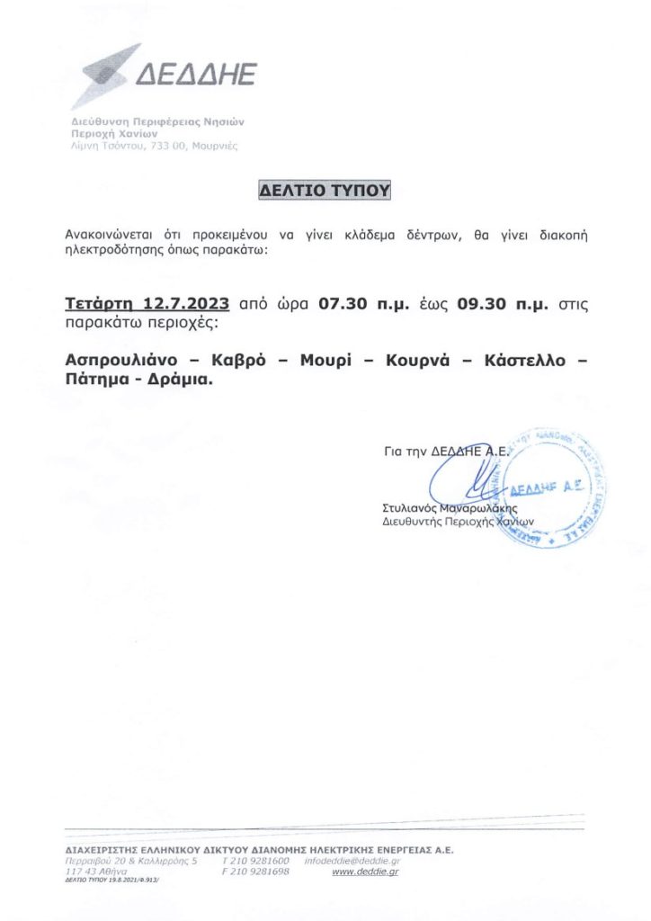 Ανακοίνωση προσωρινής διακοπής ηλεκτρικού ρεύματος