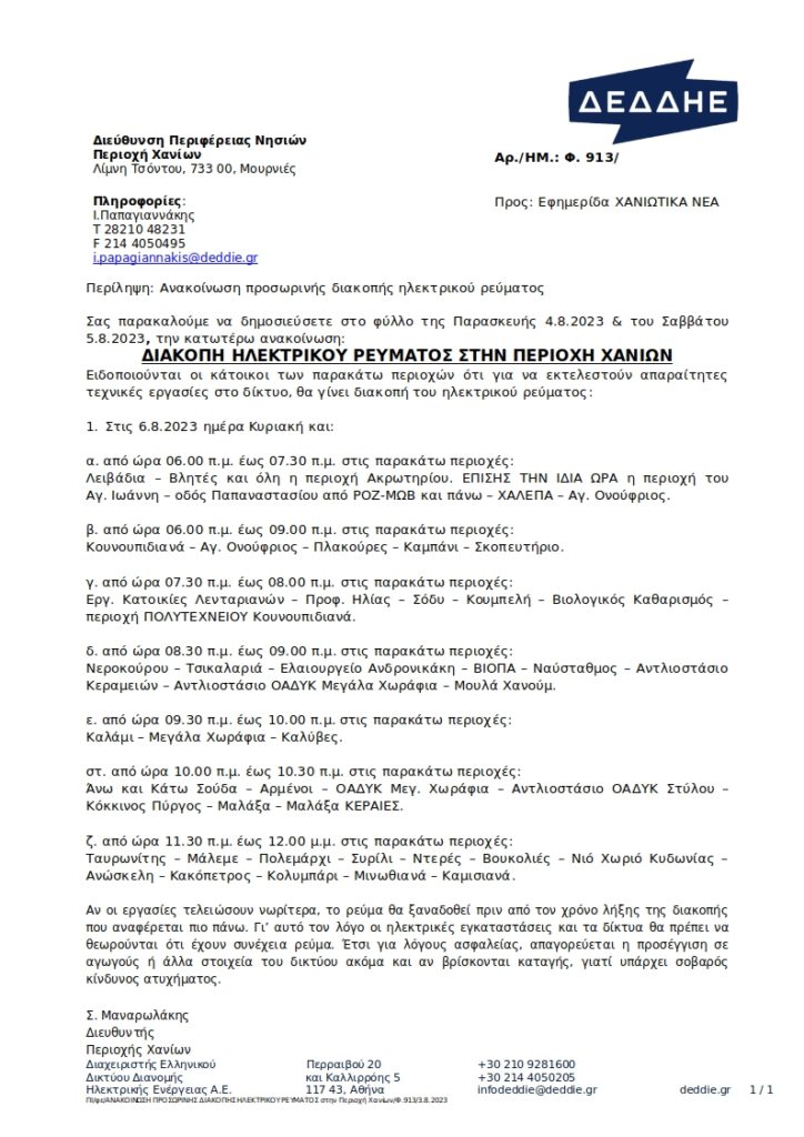 Aνακοίνωση προσωρινής διακοπής ηλεκτρικού ρεύματος