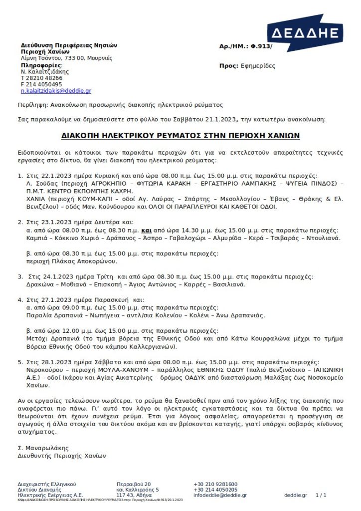 Διακοπή ηλεκτρικού ρεύματος στην περιοχή Χανίων