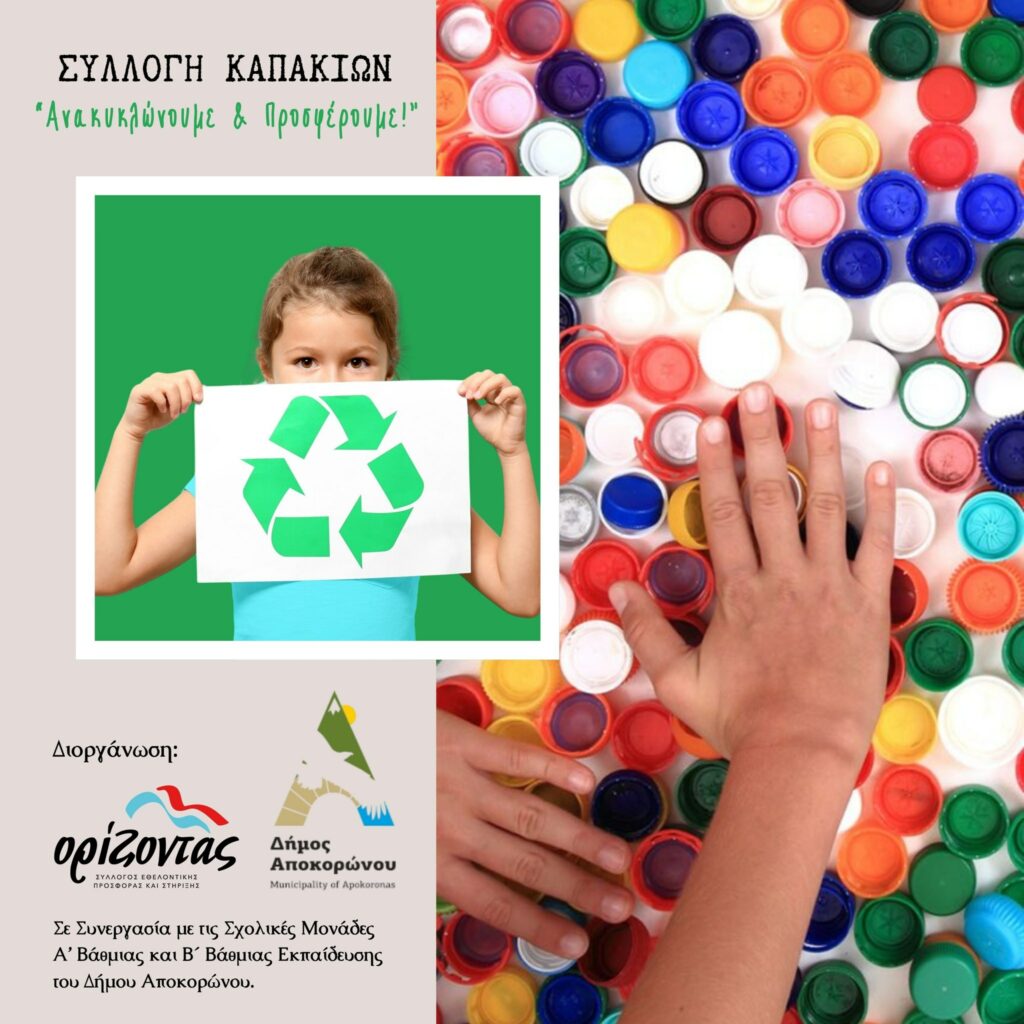 Στο πλαίσιο της συνεργασίας του Συλλόγου «Ορίζοντα» με τον Δήμο Αποκορώνου και με αφορμή την Παγκόσμια Ημέρα Ανακύκλωσης, η οποία γιορτάζεται κάθε χρόνο στις 18 Μαρτίου, ανακοινώνουμε την έναρξη Δράσης Συλλογής Πλαστικών Πωμάτων και καλούμε όλες τις σχολικές μονάδες του Δήμου να συμμετέχουν.
