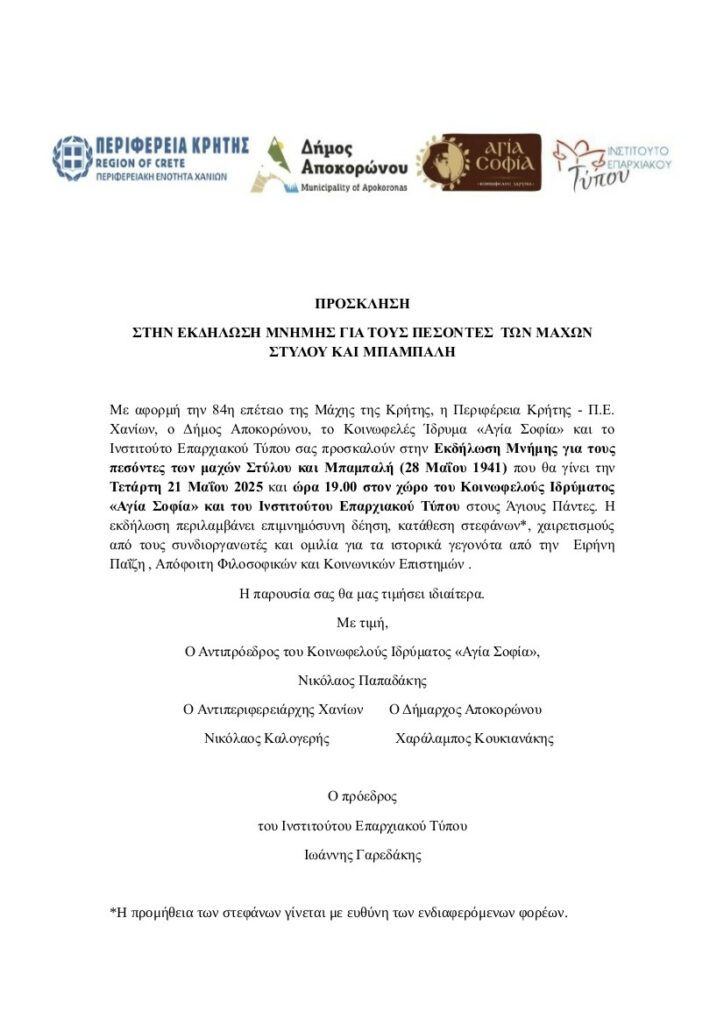 ΕΚΔΗΛΩΣΗ ΜΝΗΜΗΣ ΓΙΑ ΤΟΥΣ ΠΕΣΟΝΤΕΣ ΤΩΝ ΜΑΧΩΝ ΣΤΥΛΟΥ ΚΑΙ ΜΠΑΜΠΑΛΗ