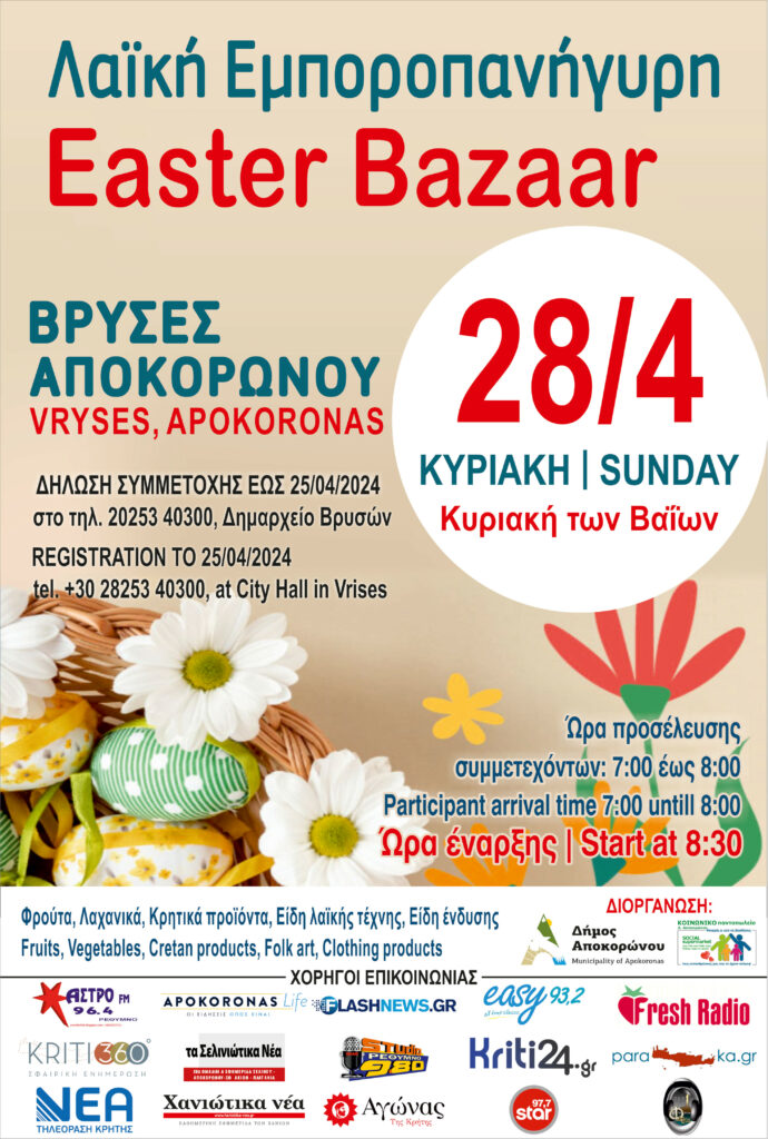 Ο Δήμος Αποκορώνου διοργανώνει και φέτος την καθιερωμένη λαϊκή αγορά – εμποροπανήγυρη στις Βρύσες (διασταύρωση προς Βαφέ-Νίππος), την Κυριακή των Βαΐων, 28 Απριλίου 2024.